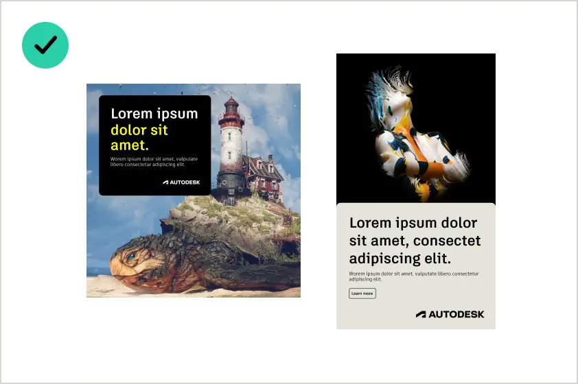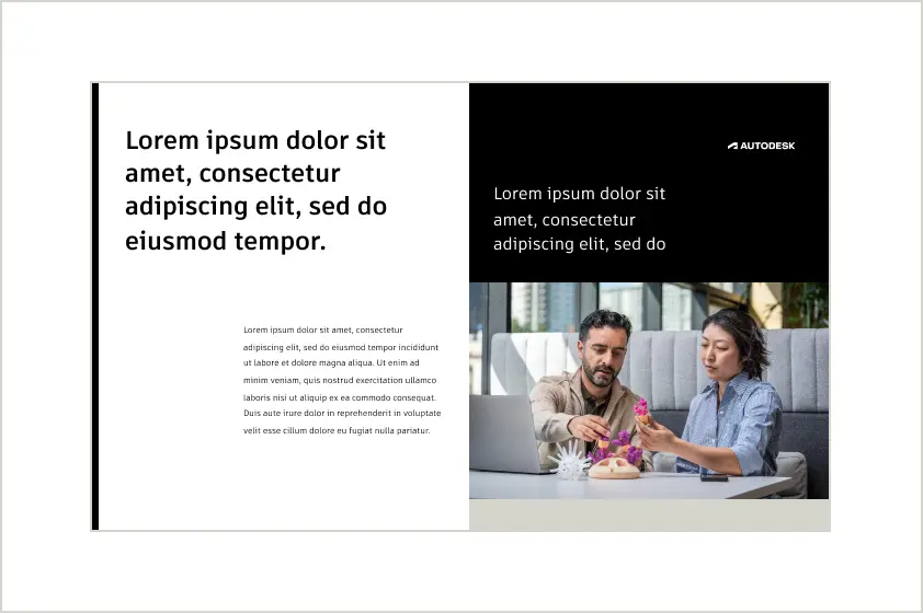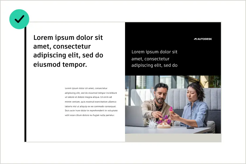 Hello Yellow and tertiary colors should make up no more than 15% of the layout, ensuring Autodesk Black, Autodesk White, and imagery remain the primary visual elements (see Color proportions and usage). Images and color blocks should work together to maintain hierarchy and avoid visual clutter, creating a balanced and cohesive design.
